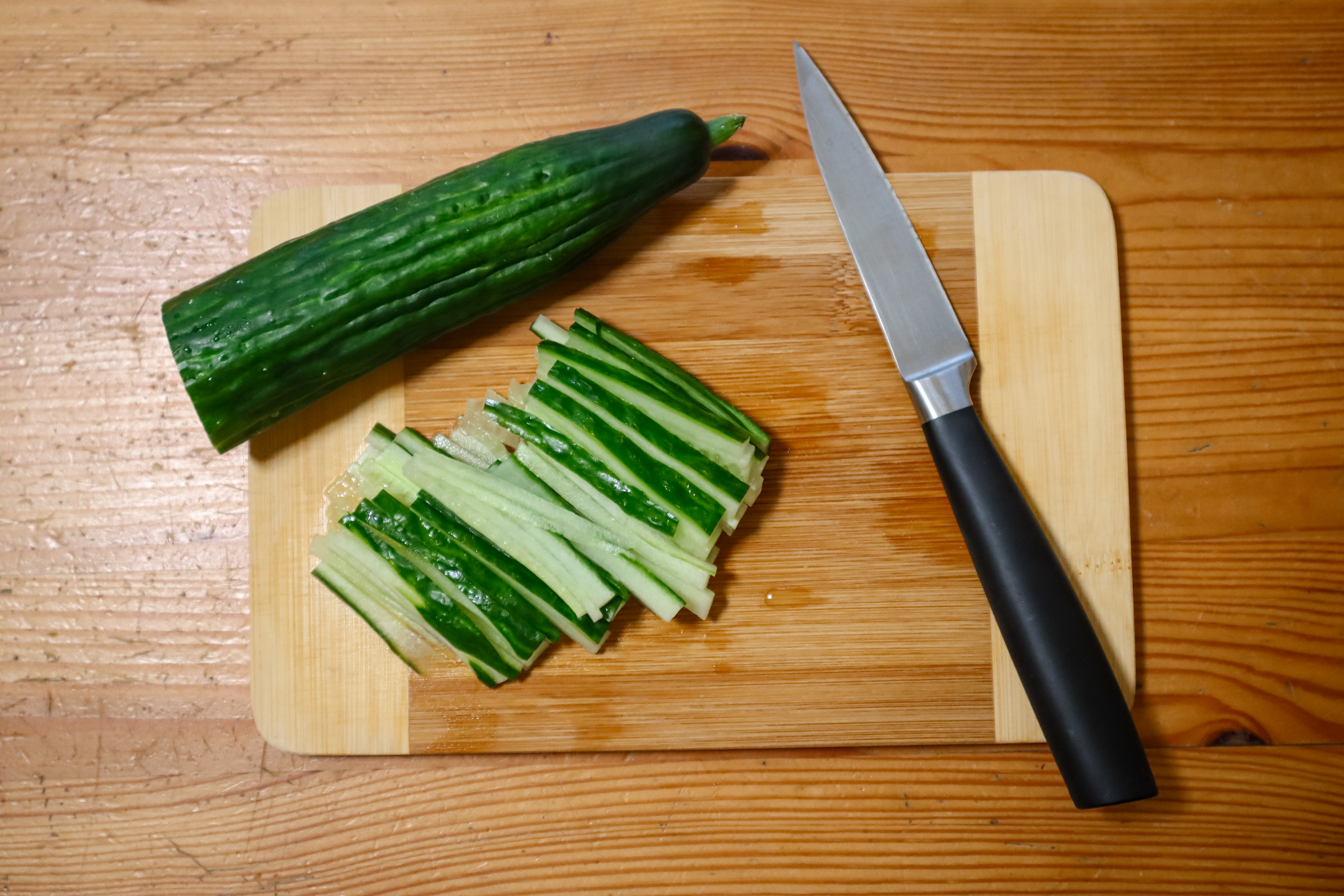 - 오이는 소면보다 넓지만 얇게 채썰어주세요. 식감을 살리면서도 면과 어울리게!